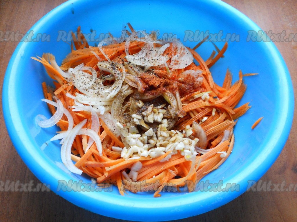Всыпать сахар, добавить измельченный зеленый лук и тщательно все перемешать. Оставить морковь для маринования на 30 минут.