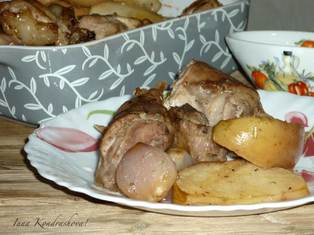 Кролик, запеченный в духовке с яблоками и луком, получается нежнейшим и таким вкусным! Лук и яблочки, пропитываясь ароматами и соками приправ и мяса, получаются очень пикантными. Попробуйте!