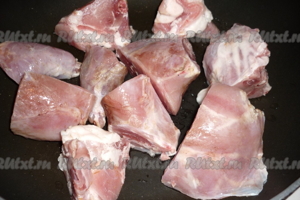 Кусочки мяса выложить на разогретую сковороду с растительным маслом и обжарить на сильном огне с двух сторон до румяной корочки (примерно 7-10 минут).