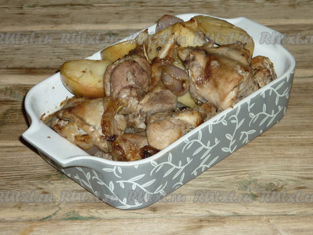 В жаропрочную форму выложить мясо кролика, яблоки и лук, влить воду (или бульон).