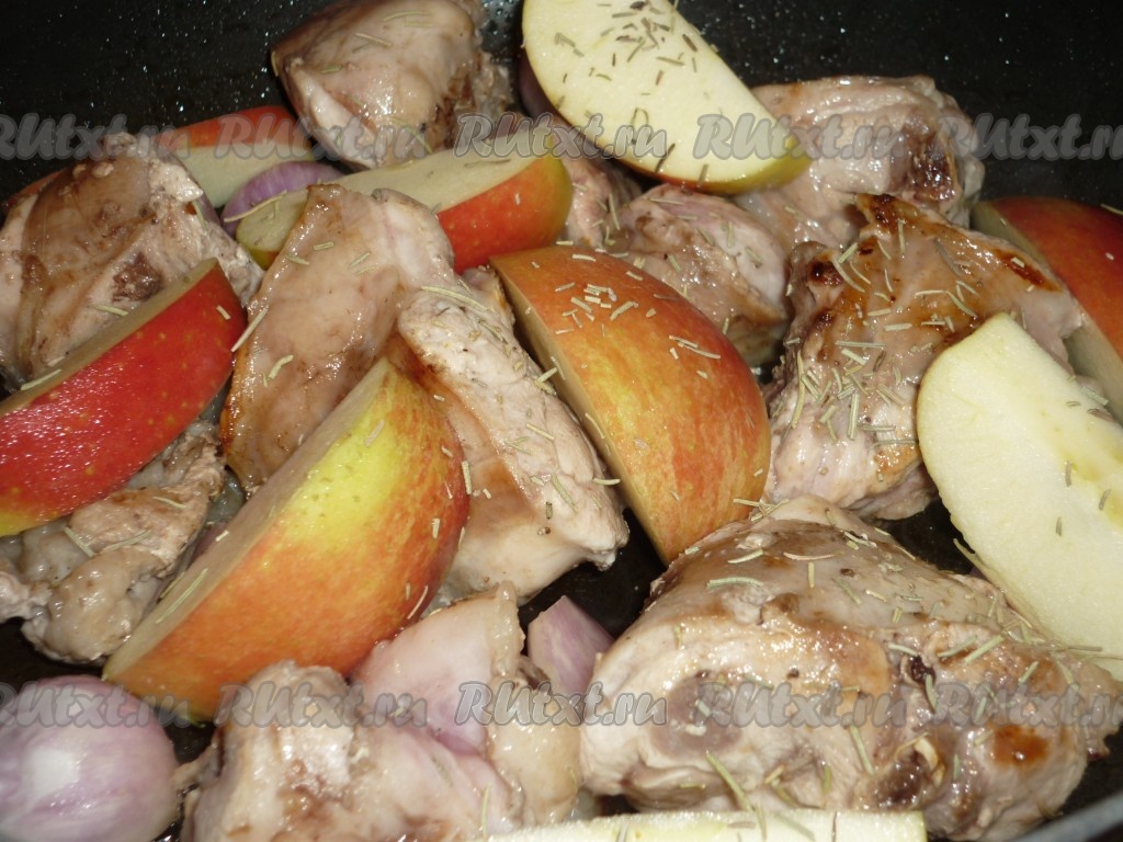 Яблоки разрезать на дольки, удалив семечки, и добавить на сковороду к кролику и луку.