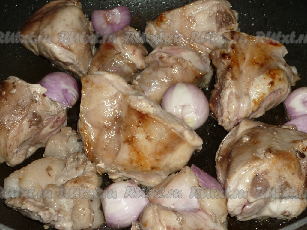 Лук очистить и добавить к мясу на сковороду. Если лук крупный, его можно разрезать на 4 части.