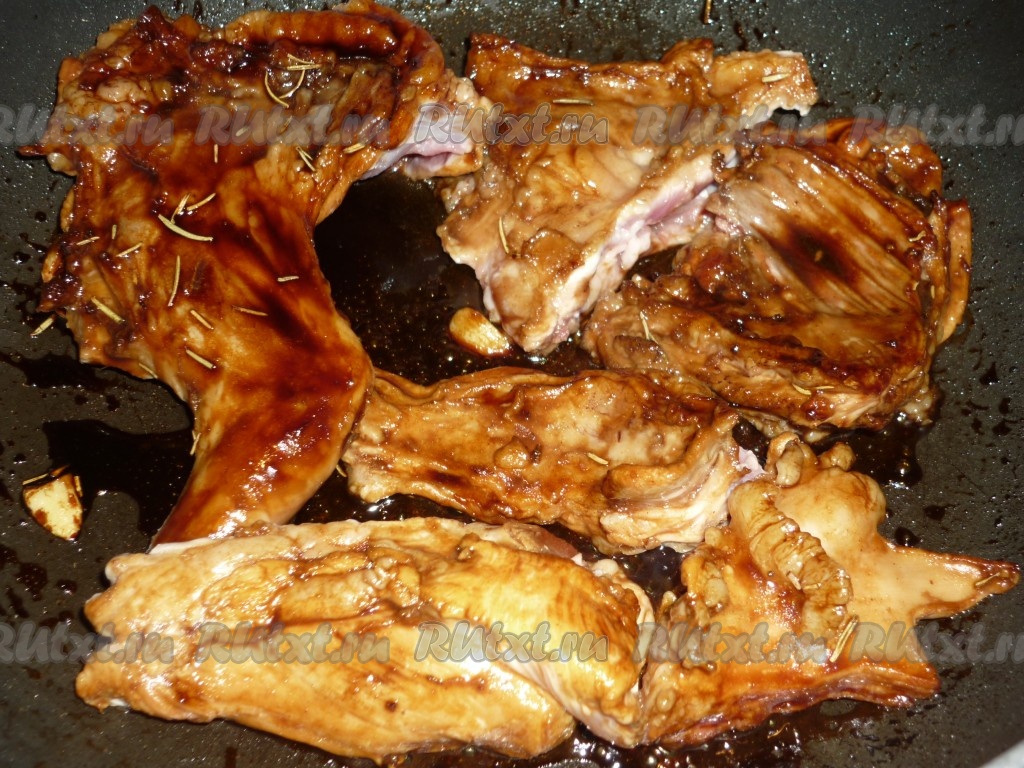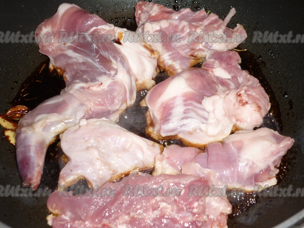 Обжарить в этой смеси на сильном огне нарезанное на небольшие куски мясо кролика с двух сторон.