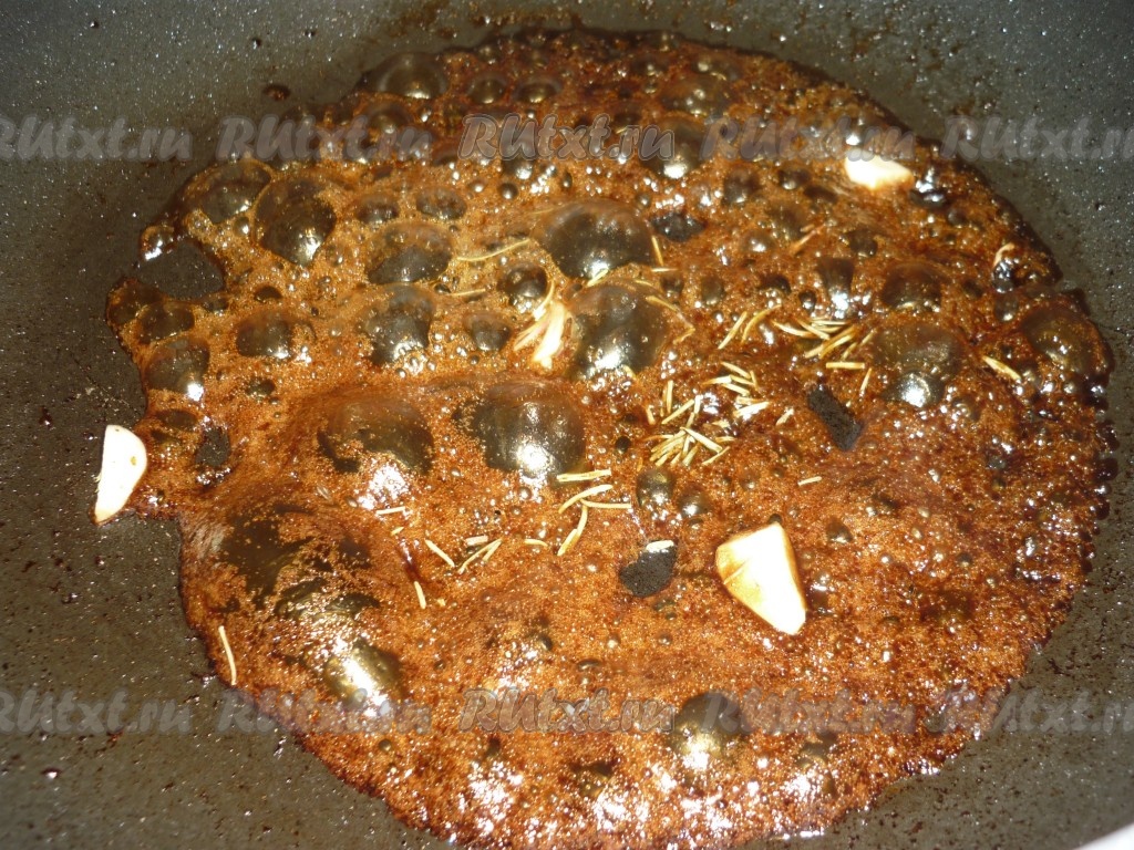 В сковороду налить растительное масло, соевый соус, мёд и добавить горчицу. Всё перемешать. Зубчики чеснока очистить и разрезать на несколько частей, отправить в сковороду вместе с розмарином.