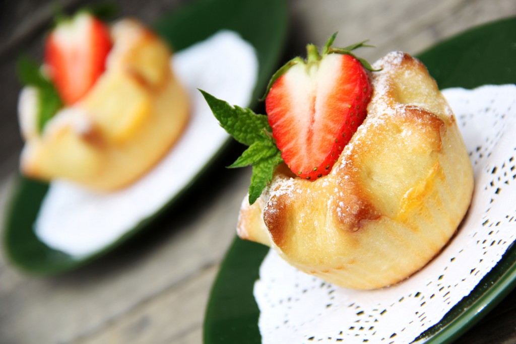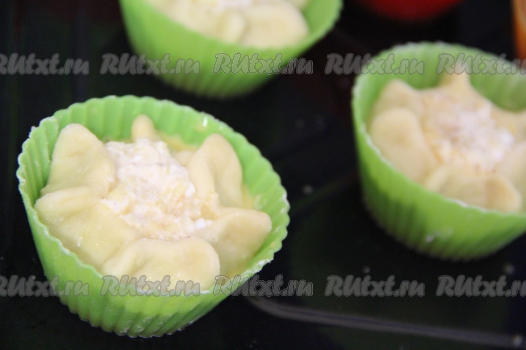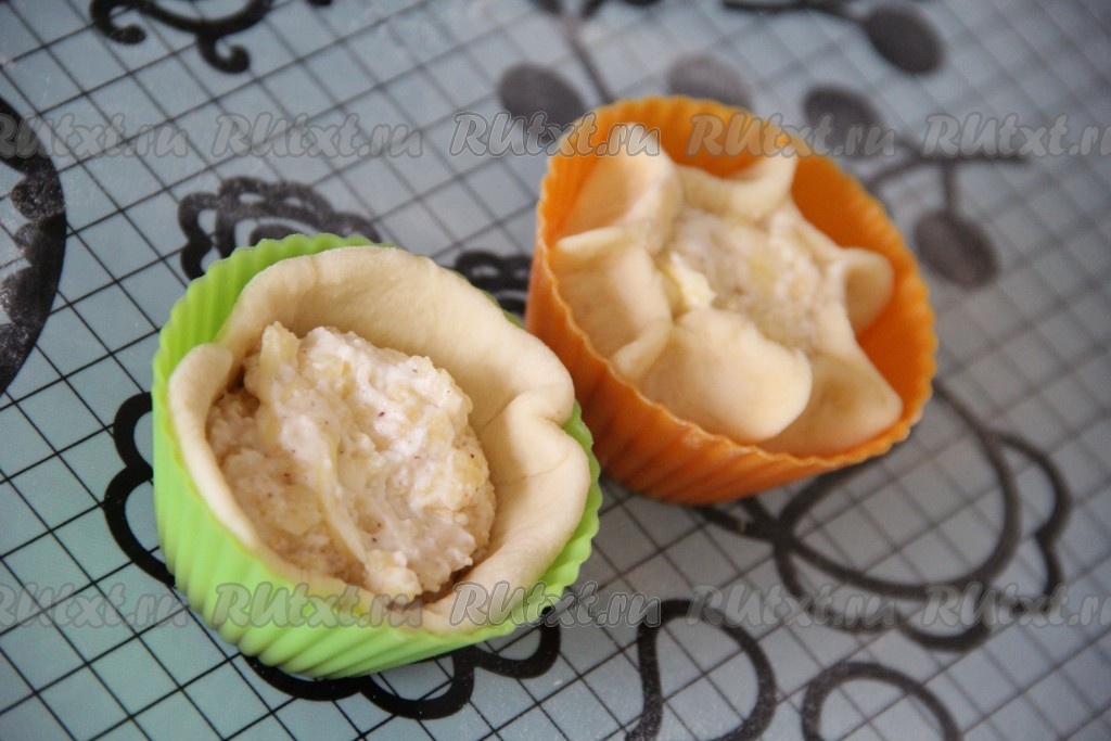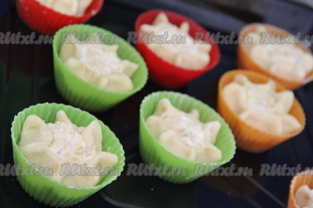 Поместить тесто в силиконовые формы, в середину выложить немного начинки. Защипать края теста так, чтобы в серединке было видно начинку.