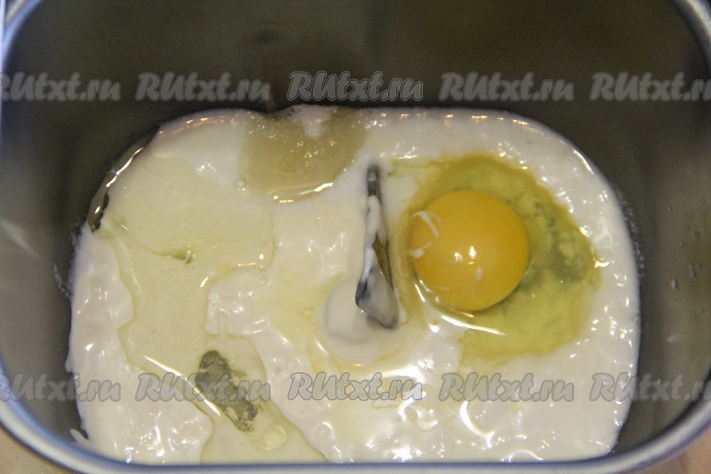 Я замес теста сделала в хлебопечке, но можно замесить тесто и руками. В ведёрко хлебопечки влить кефир комнатной температуры, добавить яйцо, сахар и растительное масло.