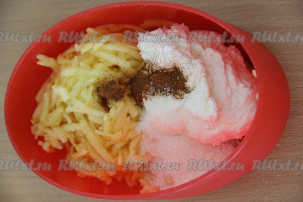 Приготовить начинку. Яблоки помыть, очистить от кожицы. Натереть яблоки на крупной тёрке. Соединить творог, измельченные яблоки, добавить корицу и сахар. Хорошо перемешать и начинка для пирожков готова.