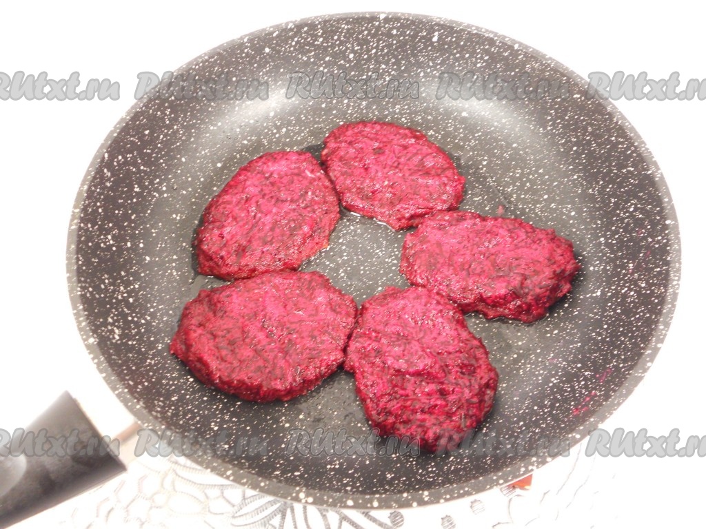Масса получится довольно густой. Выкладывать свекольную массу ложкой на разогретую с растительным маслом сковороду в виде небольших котлеток.