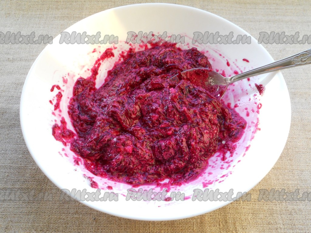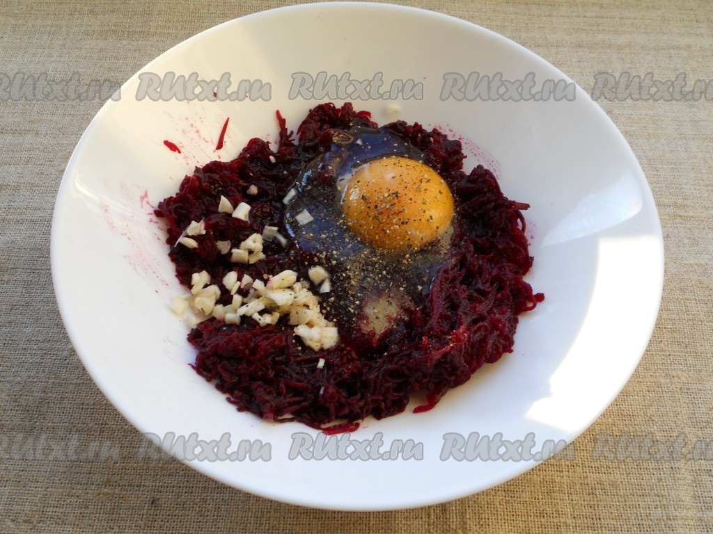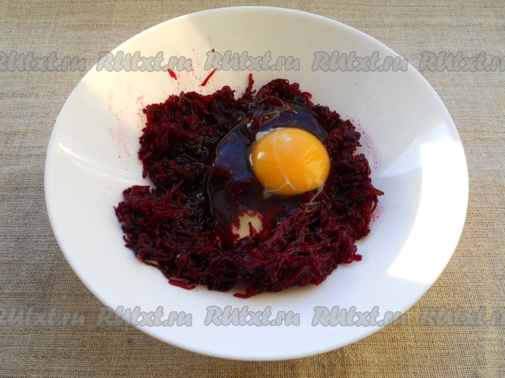 Отварить свеклу до готовности (на это потребуется 50-60 минут с начала закипания воды). Готовые корнеплоды должны легко прокалываться ножом. Свеклу остудить, очистить и натереть на мелкой тёрке. К натёртой свекле добавить сырое яйцо.