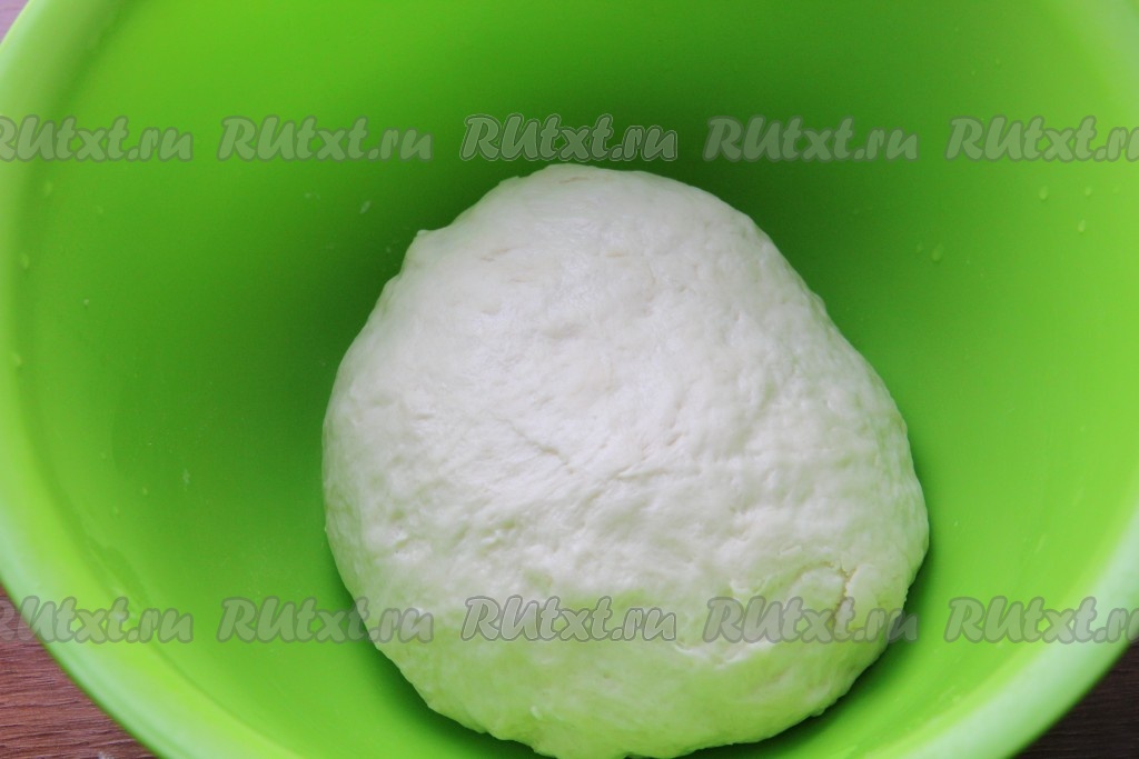 Смешать муку, воду, соль и сахар и вымесить тесто в течение 10 минут. Тесто получится мягким, эластичным, не липнущим к рукам. Оставить тесто на 10 минут под полотенцем. Отдельно развести дрожжи в 1 чайной ложке теплой воды и добавить к тесту, тщательно вымесить в течение 10 минут. Тесто скатать в шар, тщательно присыпать мукой и уложить в миску, прикрыть влажным полотенцем и оставить на 30 минут.