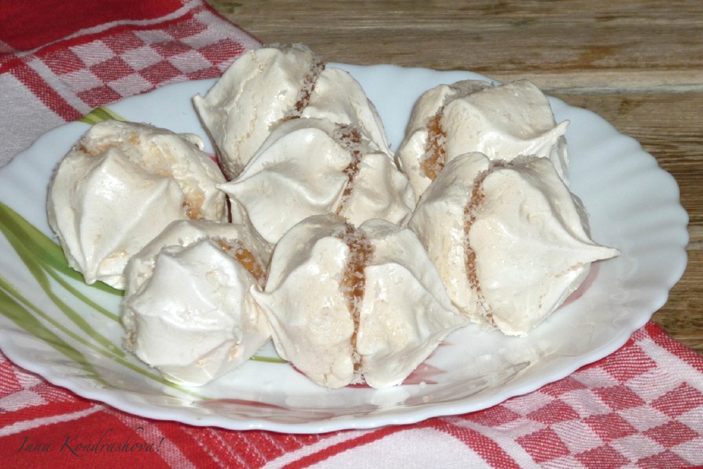 Домашнее безе само по себе получается воздушным и очень вкусным. Я решила сделать из него простые пирожные. Для этого сортируем безе по парам, прослаиваем вареньем и склеиваем по 2 безешки между собой. По желанию присыпаем стык из варенья по кругу кокосовой стружкой.