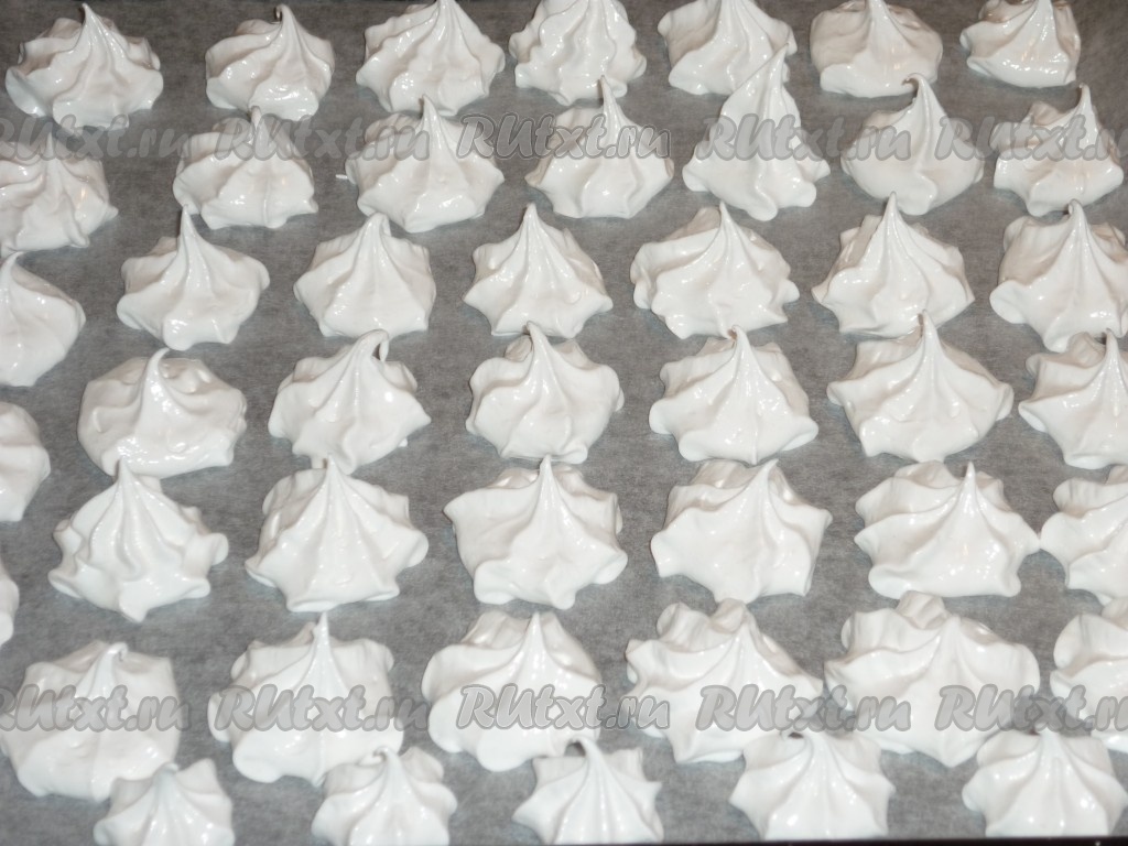 Противень застелить пергаментом. С помощью кондитерского мешка с насадкой отсадить взбитые белки на пергамент на небольшом расстоянии друг от друга. Если нет кондитерского мешка, тогда можно выкладывать белки на пергамент столовой ложки, получится не так красиво, но на вкусе безе это никак не отразится.