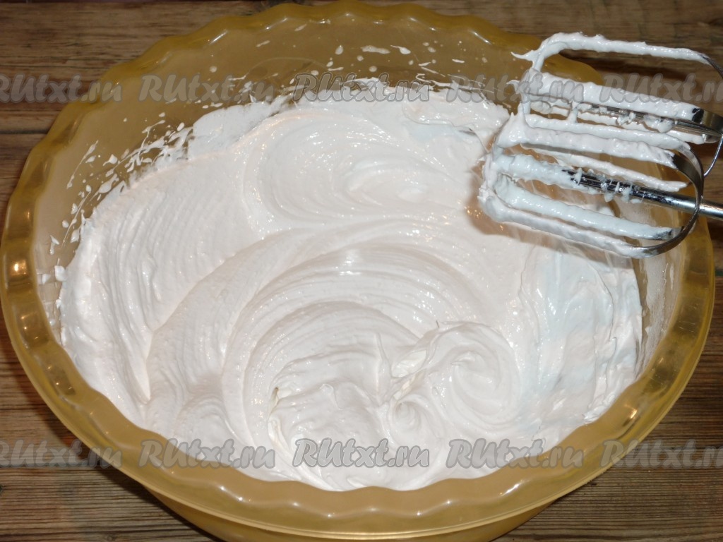 Не прекращая взбивать миксером, частями добавить сахар. Взбить белки до устойчивых пиков.