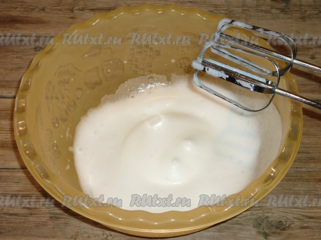 Очень аккуратно разделить яйца на белки и желтки. Влить белки в абсолютно сухую объёмную миску, в которой будет удобно взбивать миксером. Важно, чтобы в белки не попало ни капли желтка.