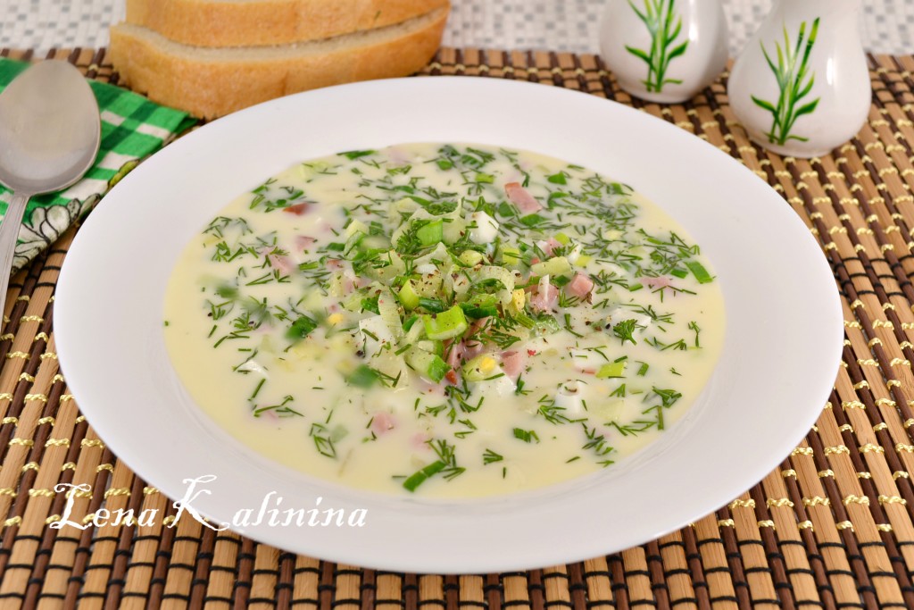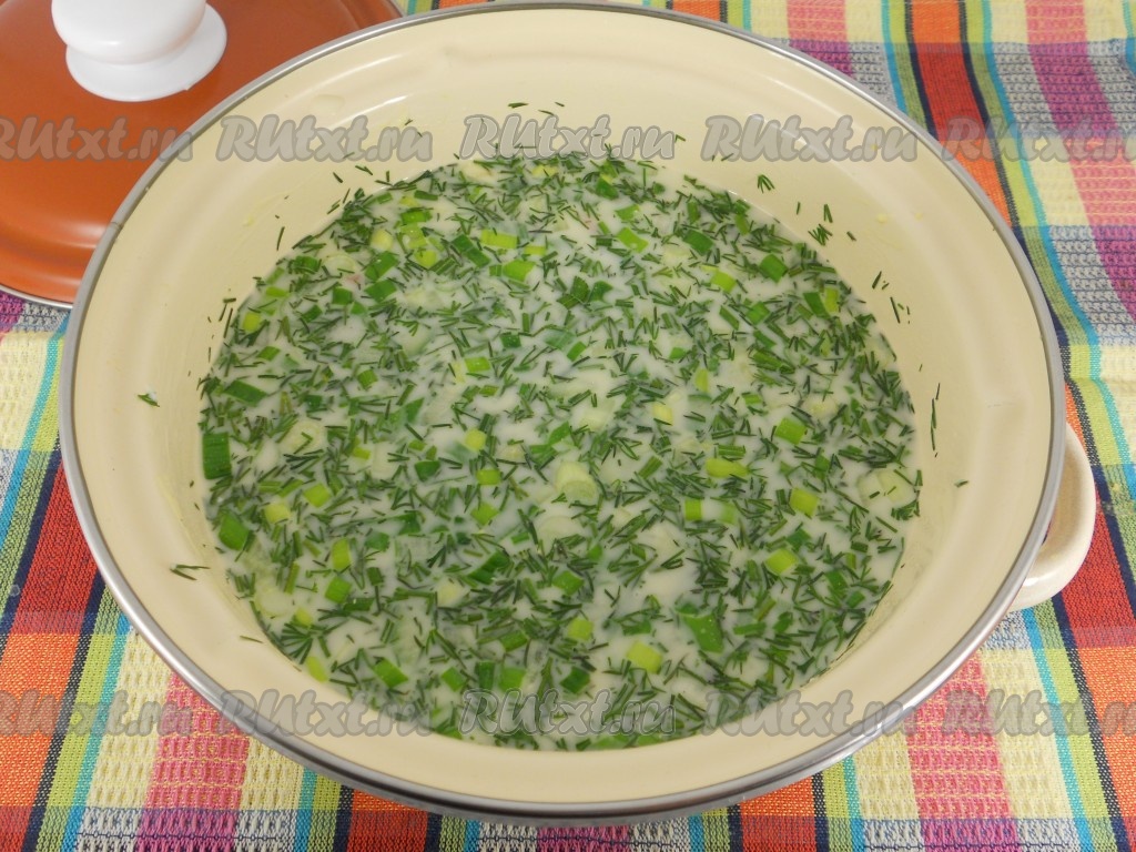 Окрошка готова! Ее нужно поместить в холодильник и дать настояться хотя бы 1 час.