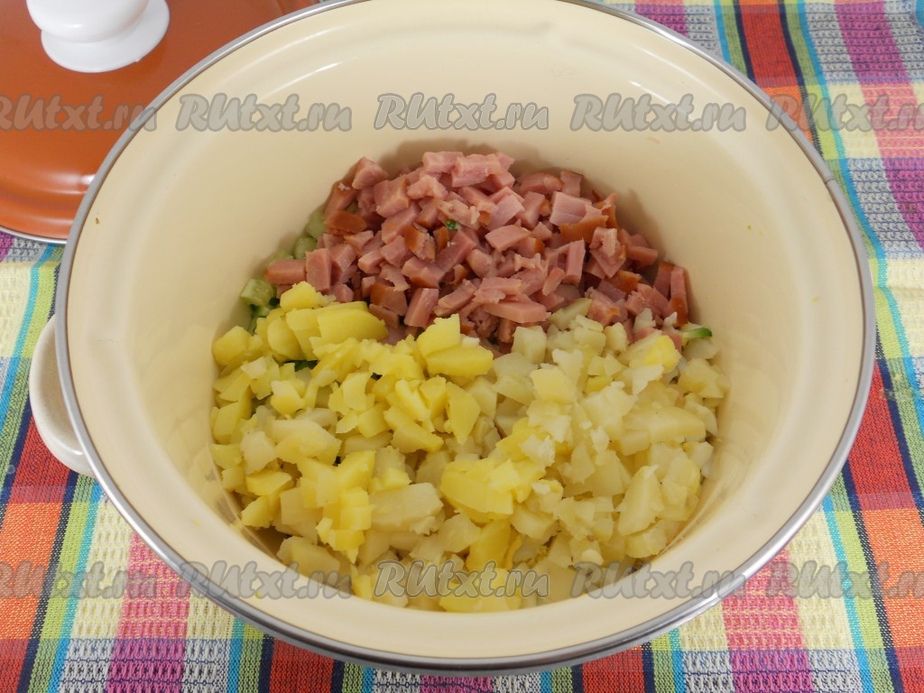 Также нарезать ветчину и очищенный картофель, отправить к яйцам и огурцам.