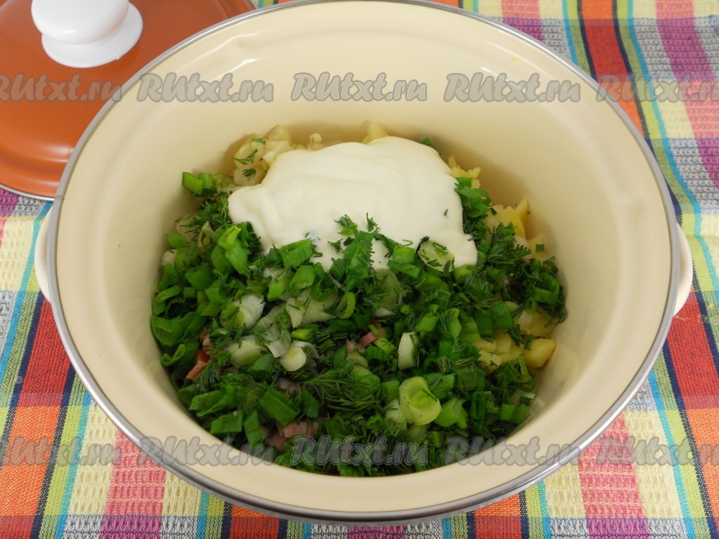 Добавить измельченную зелень лука, петрушки и укропа, майонез.