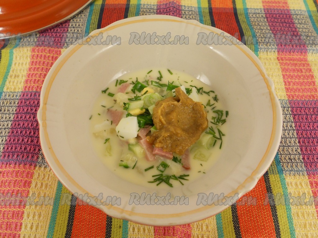 Далее в небольшую мисочку отложить несколько ложек густой части окрошки, добавить горчицу, перемешать и вылить содержимое мисочки обратно в кастрюлю. Еще раз перемешать все.