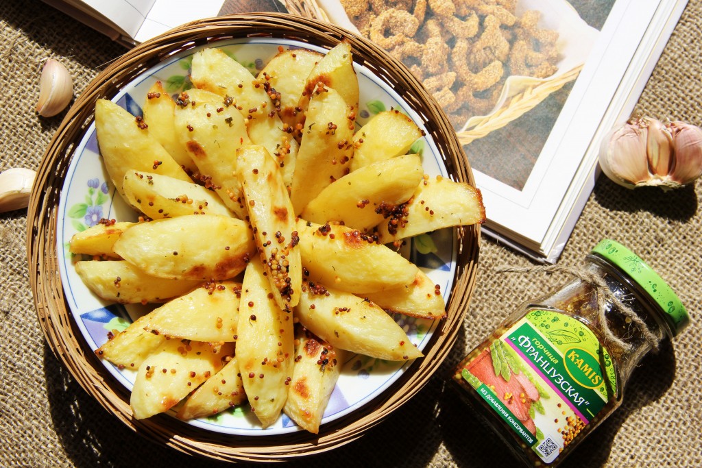 Картофель, приготовленный в горчичном соусе, подать в горячем виде. Вот такие аппетитные, вкусные и румяные картофельные дольки получились у меня. Томатный соус или соус тар-тар прекрасно дополнят это блюдо.
