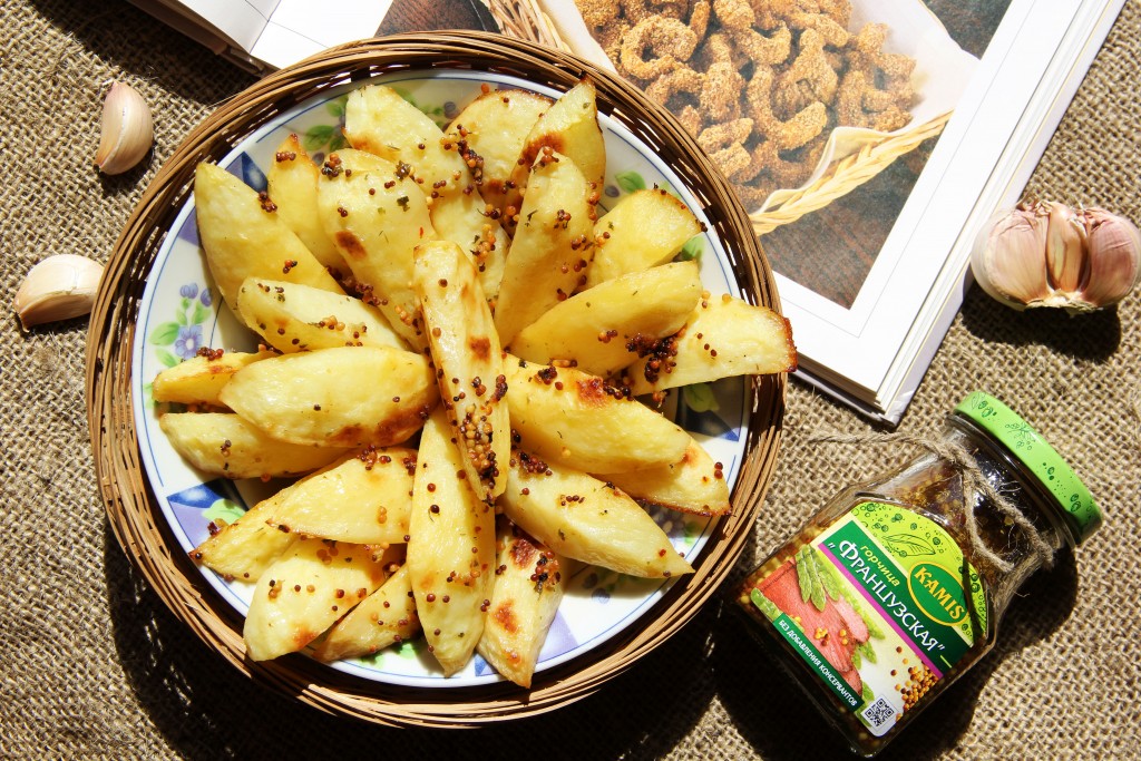 Гарнир из картошки можно приготовить разными способами. Отварить картофель, приготовить его в рукаве или сделать пюре. Жареная картошечка - одно из любимых блюд моего сына, поэтому я стараюсь разнообразить это блюдо. Хочу предложить рецепт картофеля в горчичном соусе, приготовленного в духовке. Картошка в специях и зерновой горчице получается очень аппетитный, вкусный и ароматный.