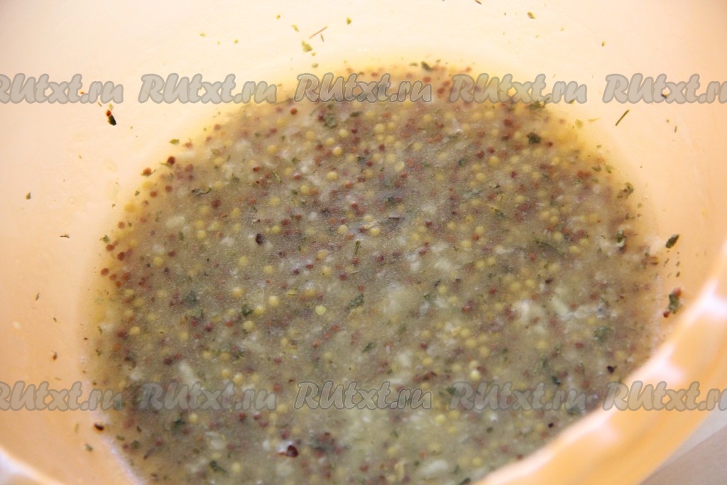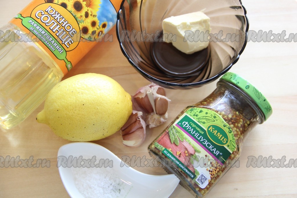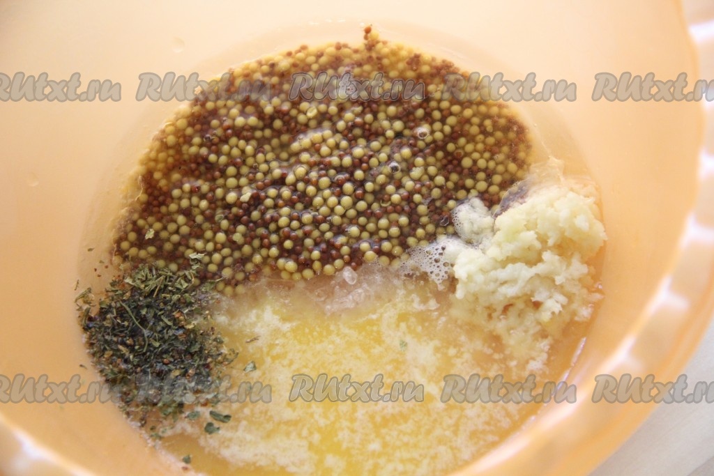 Сливочное масло растопить и слегка остудить. Чеснок очистить и пропустить через пресс. В глубокой миске соединить растопленное масло, зерновую горчицу, растительное масло, соль, чеснок, сок и цедру лимона, травы. Я использовала смесь специй "французские травы".