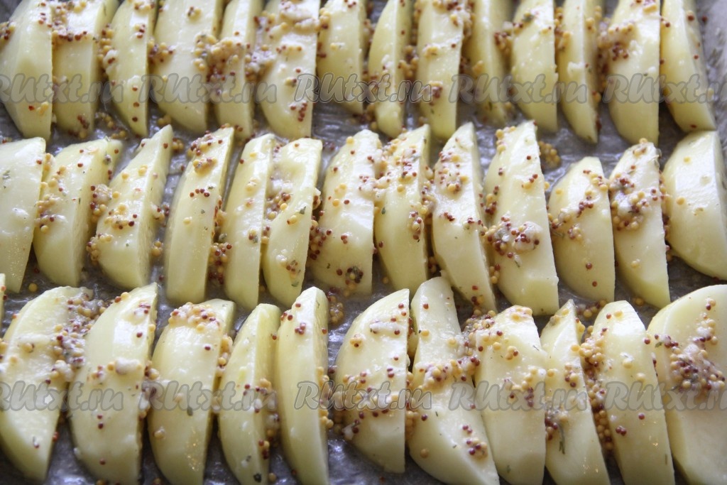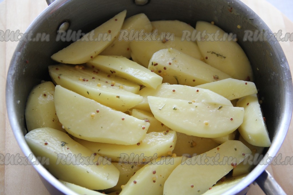 Добавить получившийся горчичный соус к картофельным долькам и тщательно перемешать.