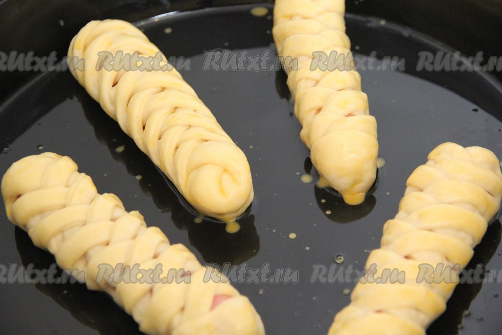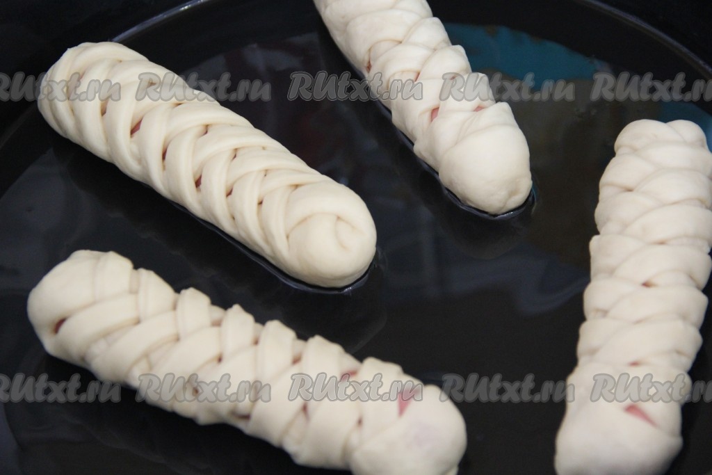 Сосиски в тесте, завёрнутые в дрожжевое тесто, выложить на противень, смазанный растительным маслом и оставить на 15-20 минут в тёплом месте для подъёма.