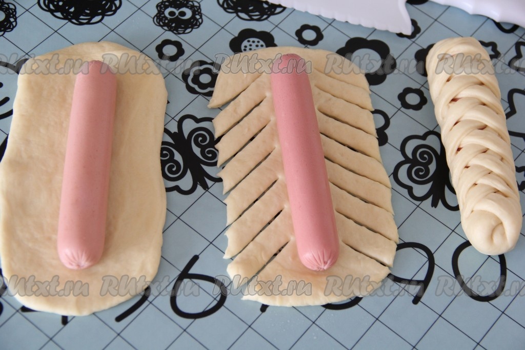 Сосиски очистить от плёнки. Тесто разделить на равные части (я разделила на 7 частей). Раскатать каждую часть теста в овал, его длина должна быть чуть длиннее сосиски. Выложить сосиску на середину овала. С помощью ножа или ножниц сделать разрезы с двух длинных сторон овала, как на фото. Завернуть сосиску в тесто, формируя колосок. Полоски теста выкладывать внахлёст друг на друга.