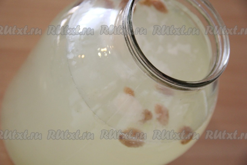 Добавить в банку с мятной водой изюм и дрожжи. Хорошо перемешать. Банку накрыть марлей и поставить в тёплое место на сутки. Я оставляю квас прямо на кухонном столе.