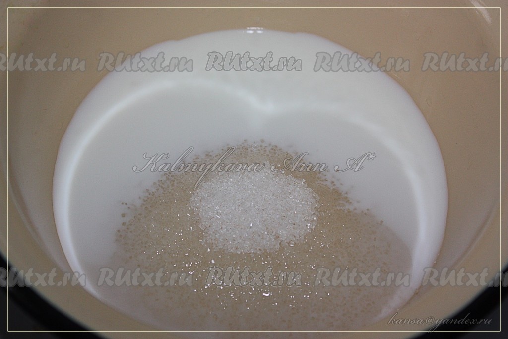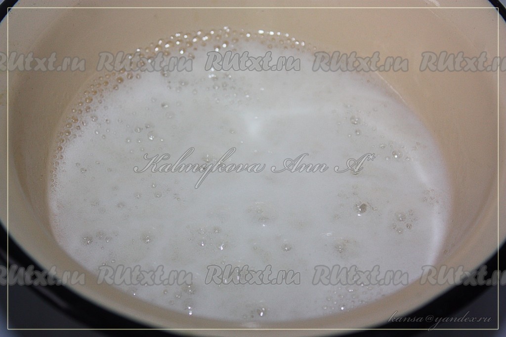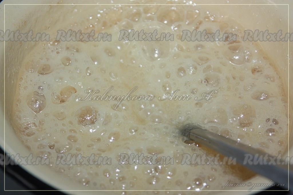 Поставить на слабый огонь и варить, непрерывно помешивая, до появления пузырьков и желтоватого цвета.