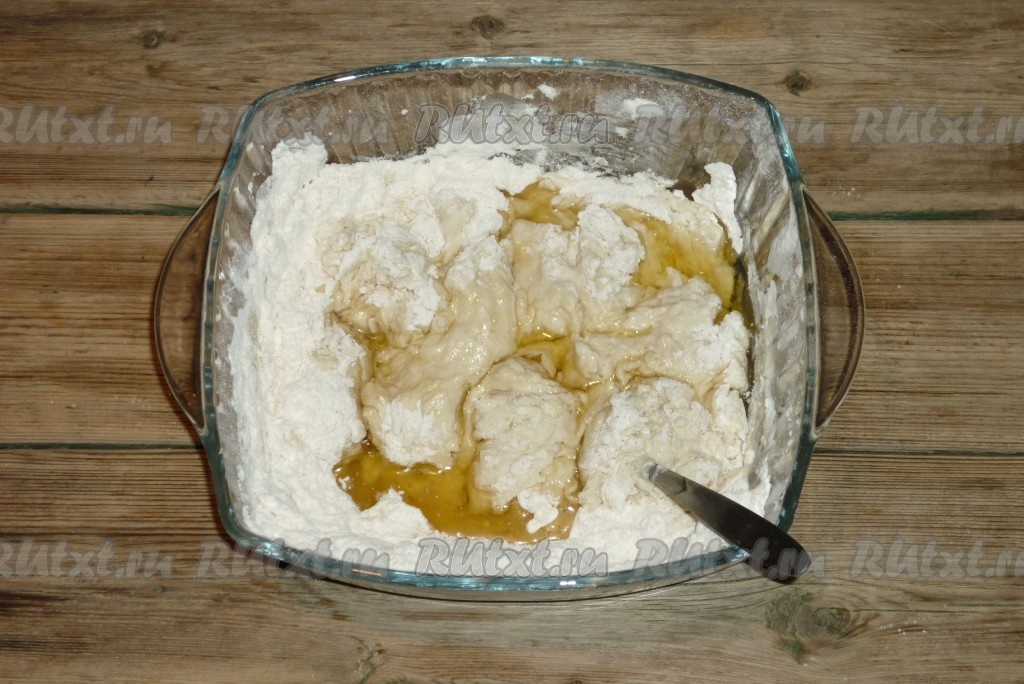 Влить растительное масло, вначале перемешать столовой ложкой, а затем тщательно вымесить тесто руками.