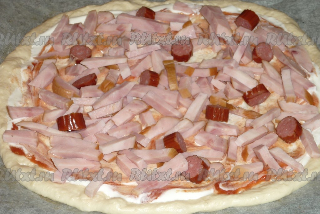 Начинки для такой пиццы могут быть самыми разнообразными. В этот раз я сделала начинку из колбасы и сыра. Тесто сверху смазать 1-1,5 столовыми ложками сметаны (или майонеза) и 1-1,5 столовыми ложками кетчупа. Колбасу нарезать на брусочки или кружочки. Выложить половину нарезанной колбасы поверх теста, смазанного сметаной (или майонезом) и кетчупом.