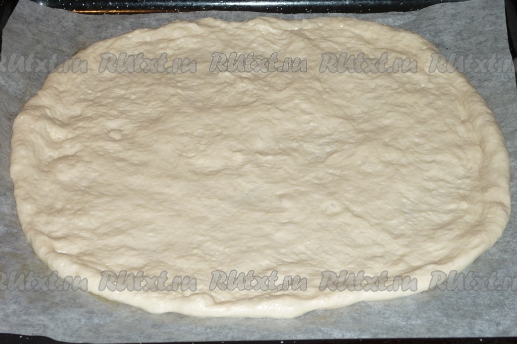 Подошедшее тесто обмять, разделить на 2 части (я предпочитаю из указанного количества ингредиентов формировать 2 пиццы с тонкой основой). Раскатать вначале одну часть теста на столе, присыпанном мукой, в меру тонкий круг, сформировав небольшой бортик, затем переложить на противень, застеленный пергаментом.
