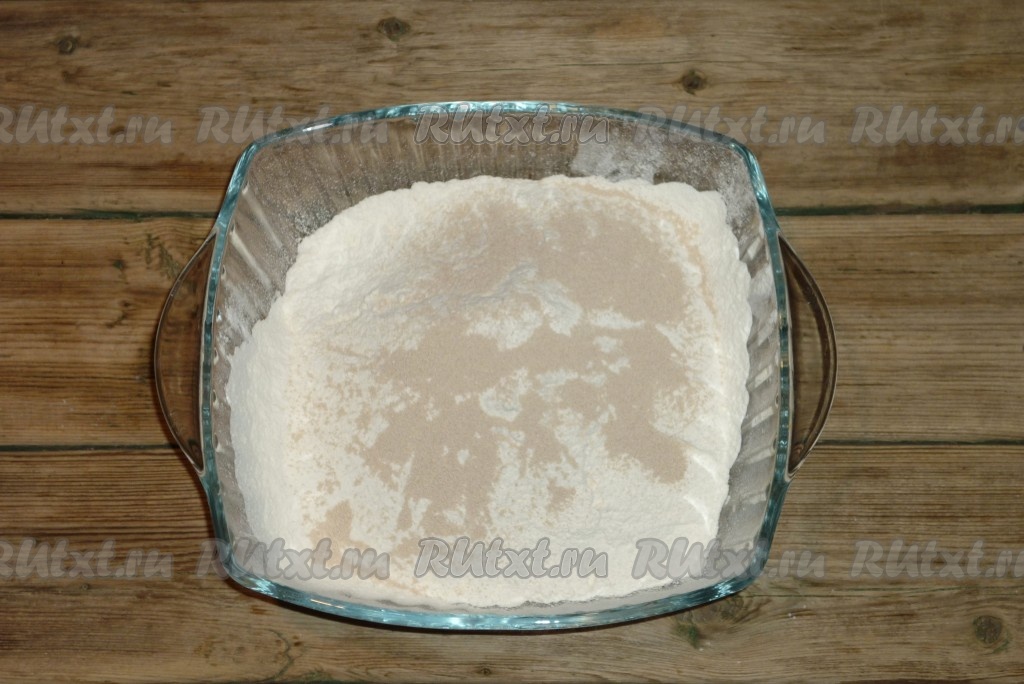 Для замешивания постного теста для пиццы нужно в миске смешать просеянную муку с солью, сахаром и дрожжами.