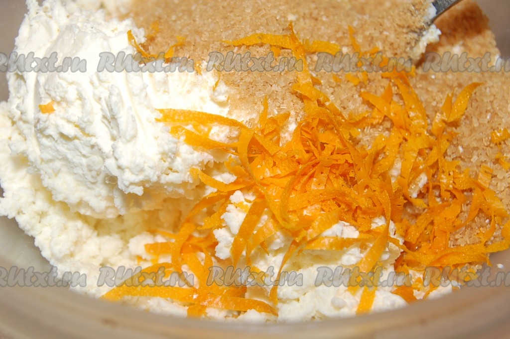 Чтобы начинка получилась более однородной и нежной, лучше сыр, сахар и цедру смешать электрическим миксером.