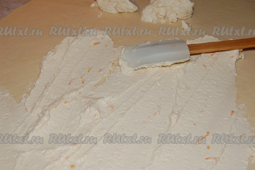 Аккуратно, лопаточкой распределим творожную начинку по всей поверхности теста.