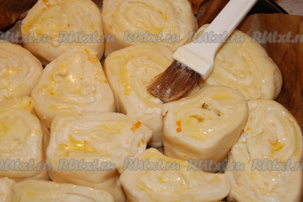 Поверхность булочек смазываем растопленным сливочным маслом и отправляем в заранее нагретую до 180 градусов духовку, минут на 20-30.