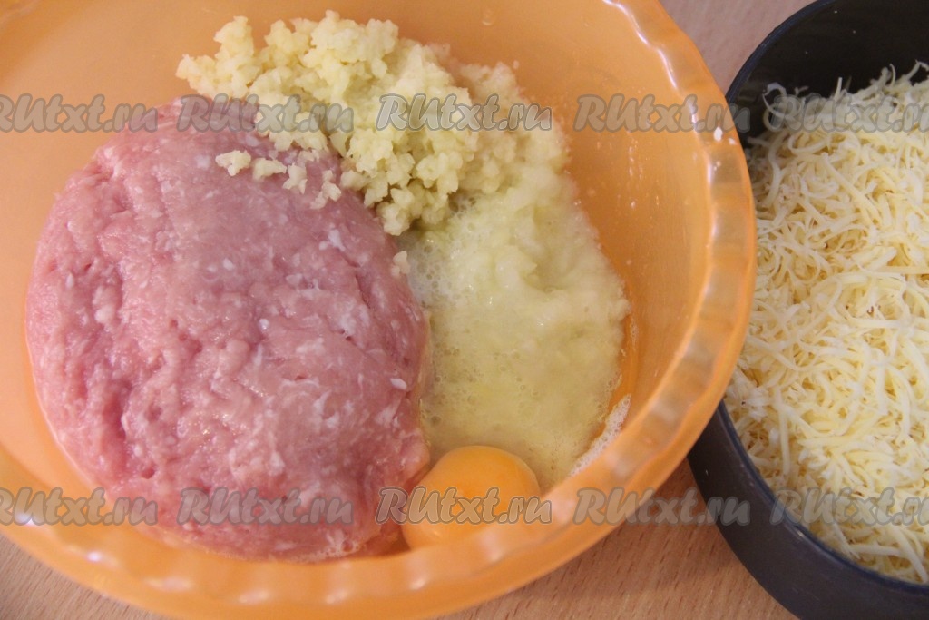 Сыр натереть на мелкой тёрке. Для котлет хорошо подойдёт "Российский" или "Пошехонский" сыр. Картофель очистить и пропустить через мясорубку. Лук очистить и мелко нарезать или пропустить через мясорубку. В глубокую миску выложить куриный фарш, добавить картофель, яйцо и лук.