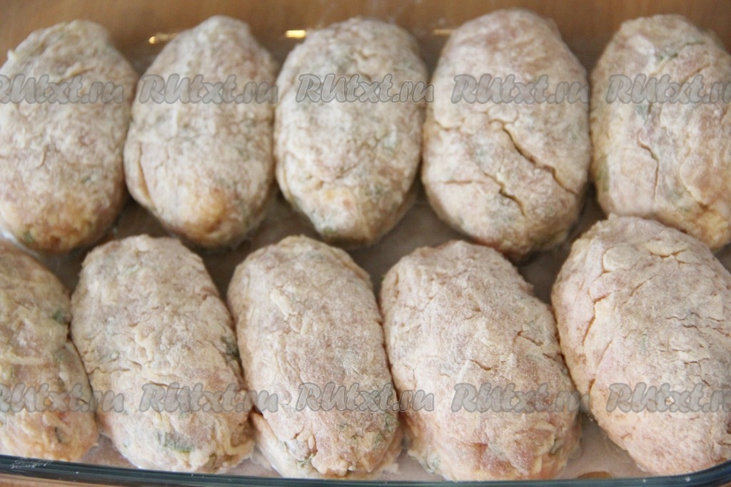 Небольшую часть получившегося куриного фарша выложить в тарелку с мукой. Обвалять фарш в муке, сформировать котлету любой формы. Аналогично сформировать остальные котлеты.