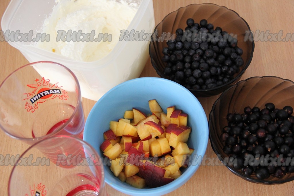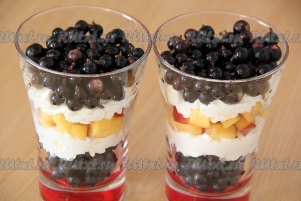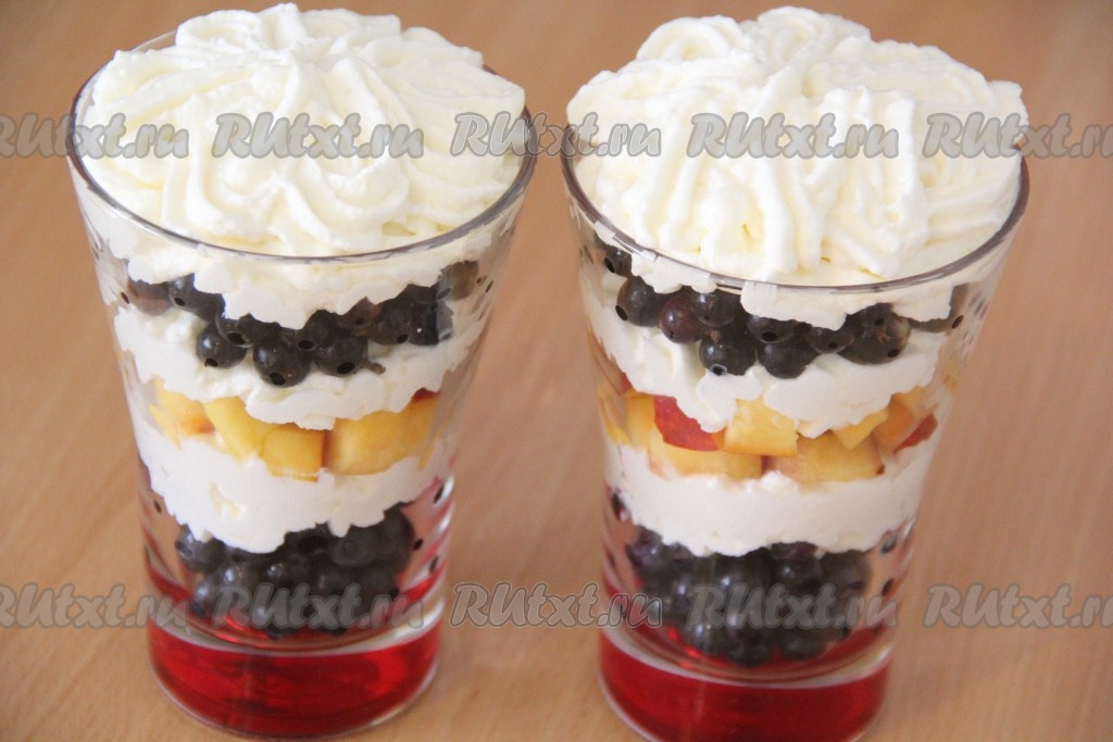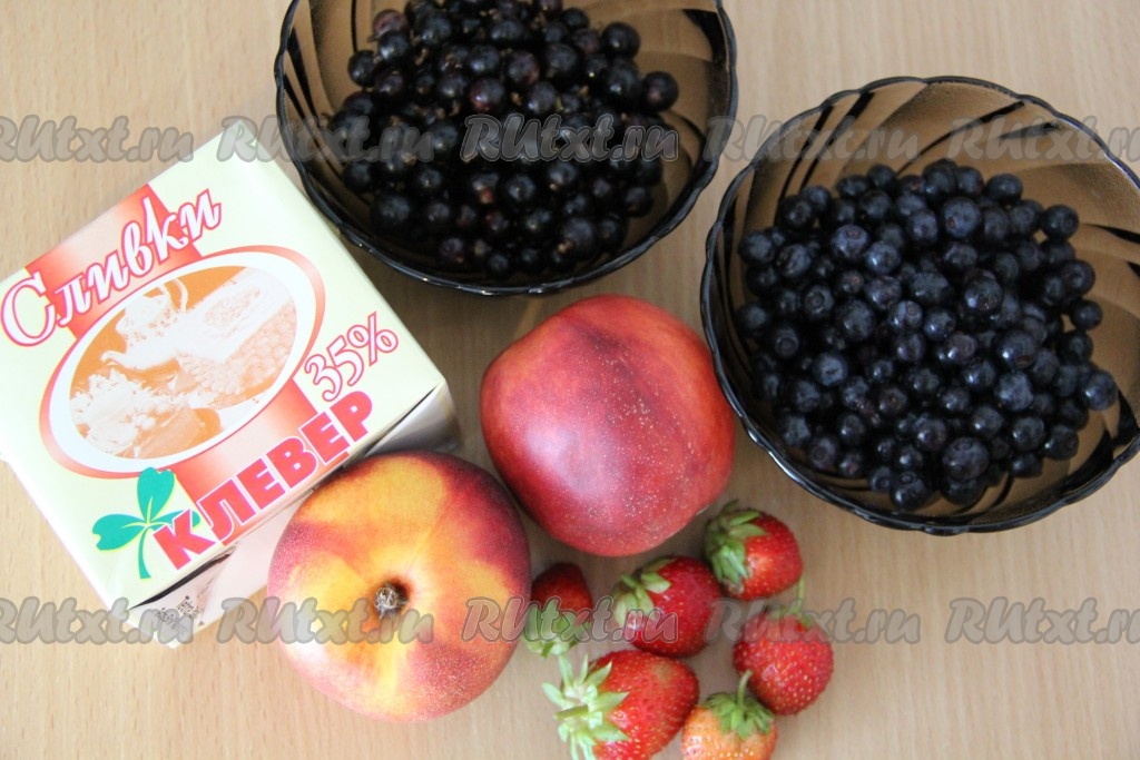 Затем выложить слой из фруктов, покрыть фрукты взбитыми сливками. Далее выложить слой ягод.