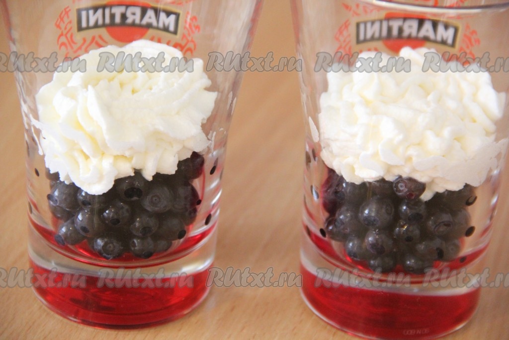 Я для более удобного формирования десерта выложила сливки в кондитерский мешок. Десерт формировать слоями. На дно стаканов или фужеров выложить часть ягод. Затем выложить небольшое количество взбитых сливок.