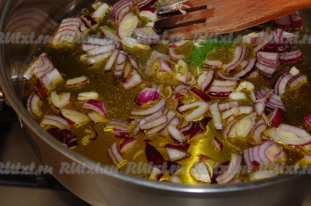 Возьмем сковороду, нальем в нее оливковое масло и слегка обжарим лук.