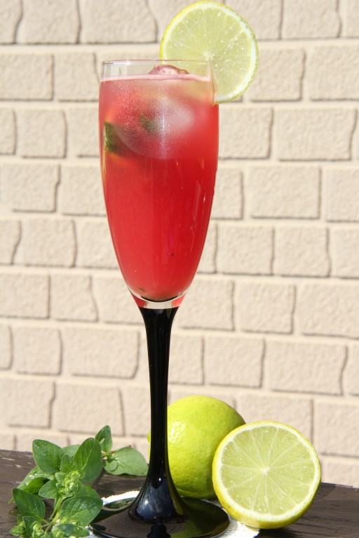 В фужеры выложить кусочки льда, разложить ароматную мятно-лаймовую массу и всё залить арбузным соком.