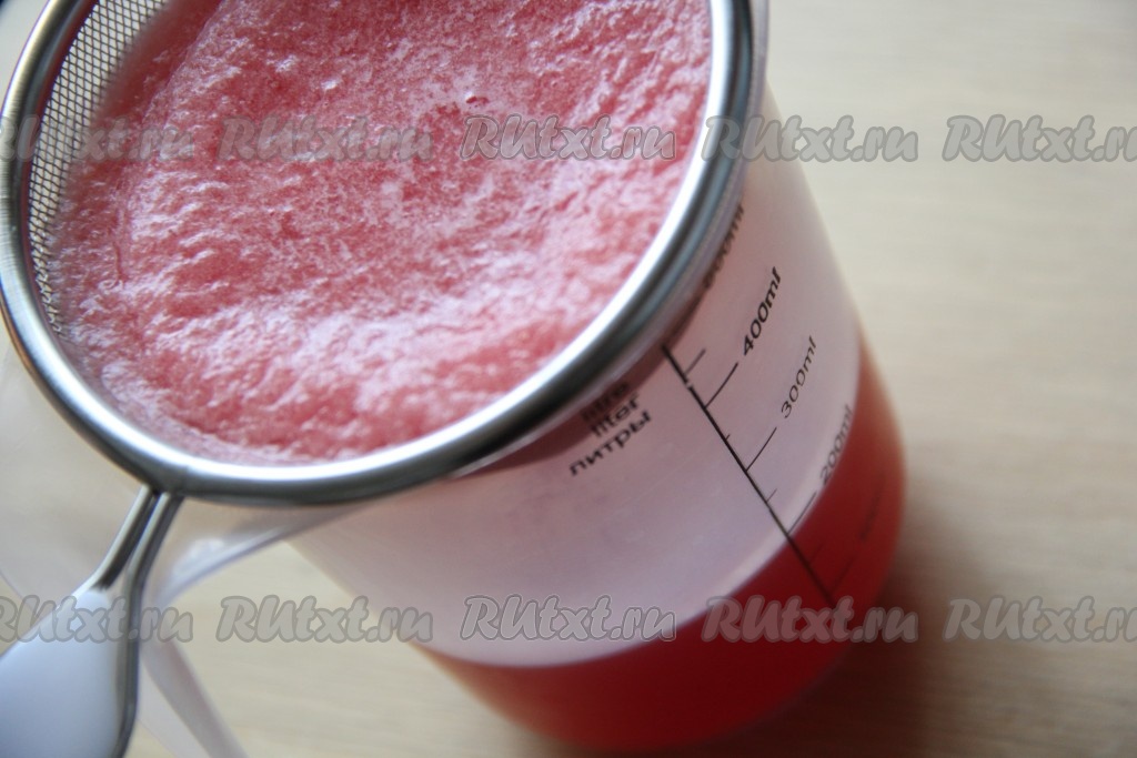Получившееся арбузное пюре выложить на сито и процедить. Можно слегка отжать арбузную мякоть.