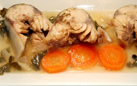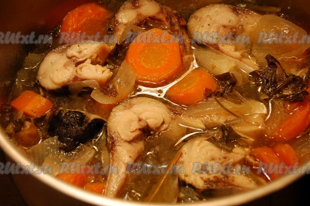 Затем опускаем в смесь вина и овощей кусочки скумбрии и варим ещё 10 минут.