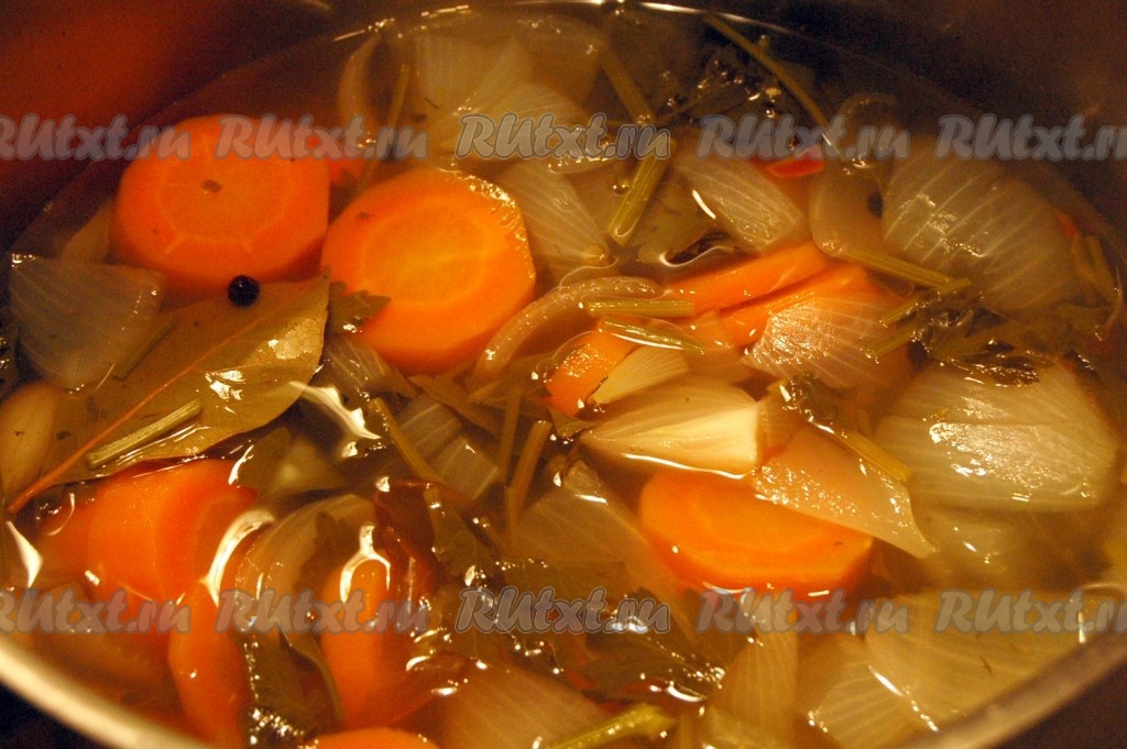 Вино переливаем в кастрюлю, добавляем овощи, специи, соль и доводим до кипения, уменьшаем огонь и варим 15 минут.