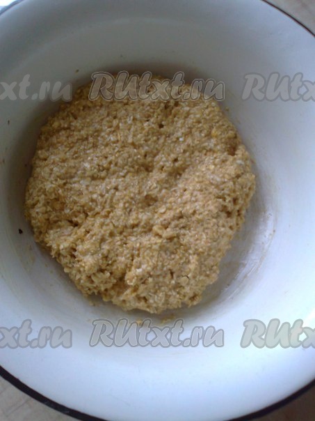 Венчиком взбить яйца с сахаром (или с медом), щепоткой соли, добавить 1 столовую ложку растительного масла, 1 чайную ложку разрыхлителя (или соду, погашенную уксусом), измельченные овсяные хлопья. Хорошо перемешать и тесто для печенья готово.