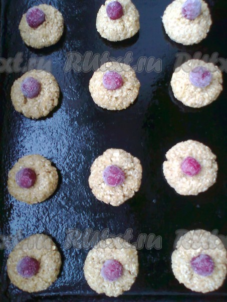 Сформировать мокрыми руками шарики размером с грецкий орех. Выложить на противень, слегка смазанный растительным маслом, немного приплюснуть. Сверху на каждое овсяное печенье выложить вишенку (или другую ягодку), слегка утопить.