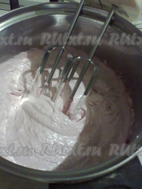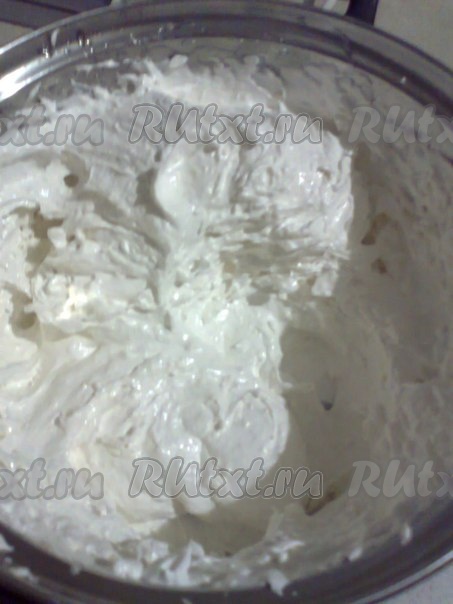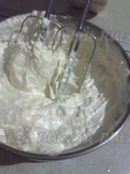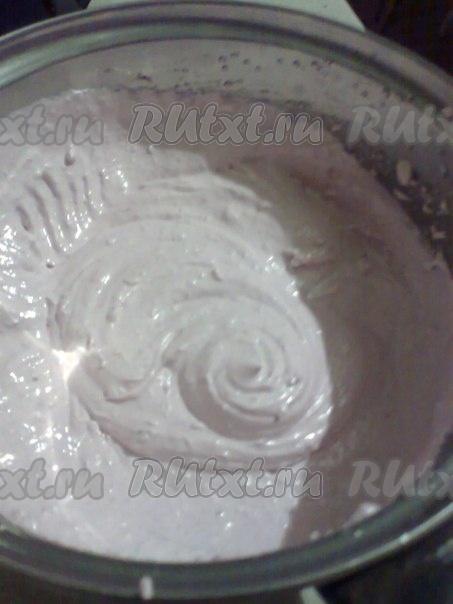 Добавляем оставшуюся половину белка и продолжаем взбивать в течение 5 минут, пока масса не увеличится в объеме, посветлеет и станет пышной.
