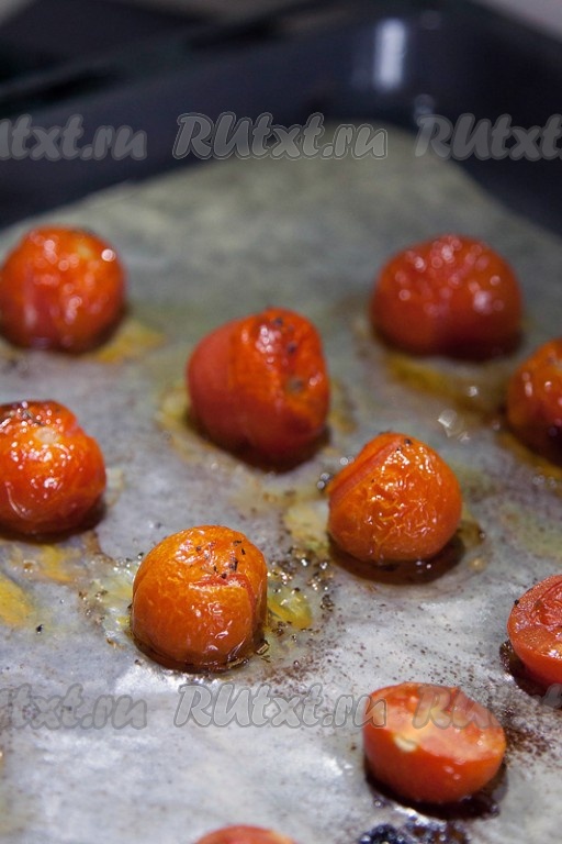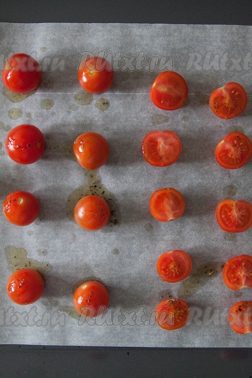 Разогрейте духовку до 180 градусов. Застелите противень пекарской бумагой и выложите помидоры (целые или половинки), полив их подготовленным пряным оливковым маслом.